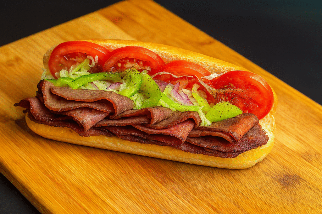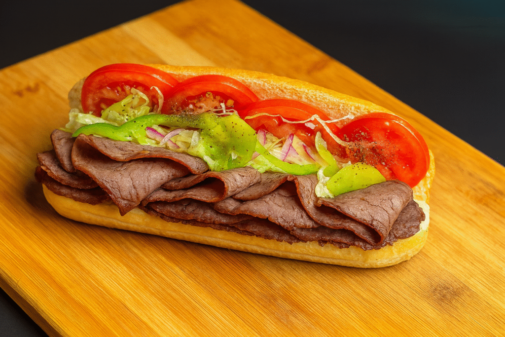 Medium Subs – $12.00 | Large Subs – $14.00 a freshly made roast beef sub on a hoagie roll, layered with thinly sliced roast beef, shredded lettuce, tomatoes, green bell peppers, red onions, and a dash of black pepper.