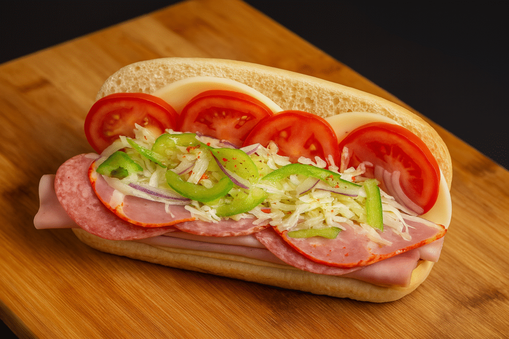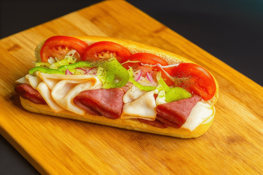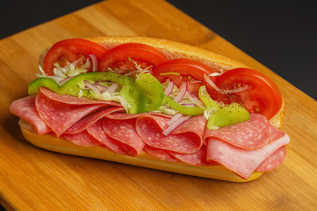 Medium Subs – $12.00 | Large Subs – $14.00 A classic Italian sub stacked with layers of salami, ham, and provolone, topped with shredded lettuce, green peppers, red onions, and juicy tomato slices all served on a fresh, soft sub roll.