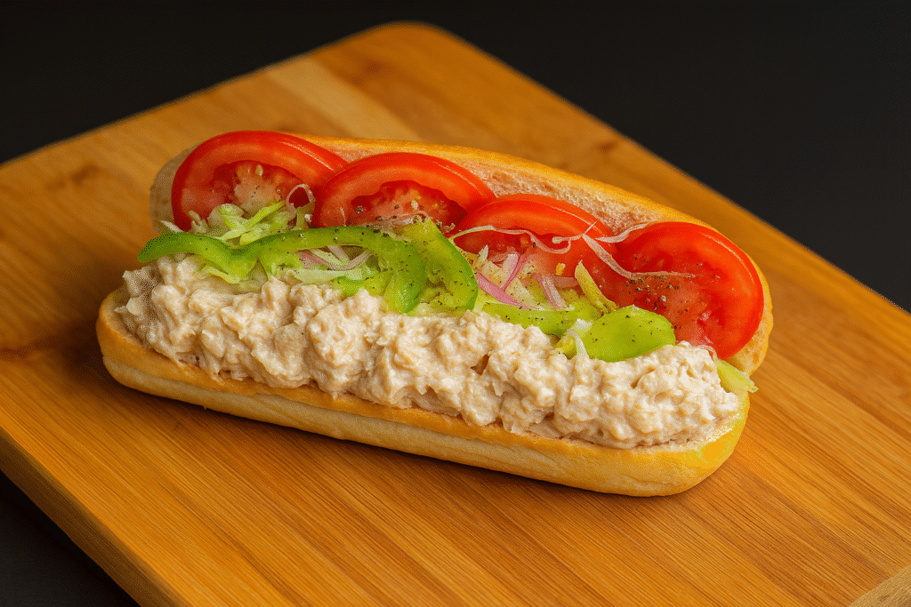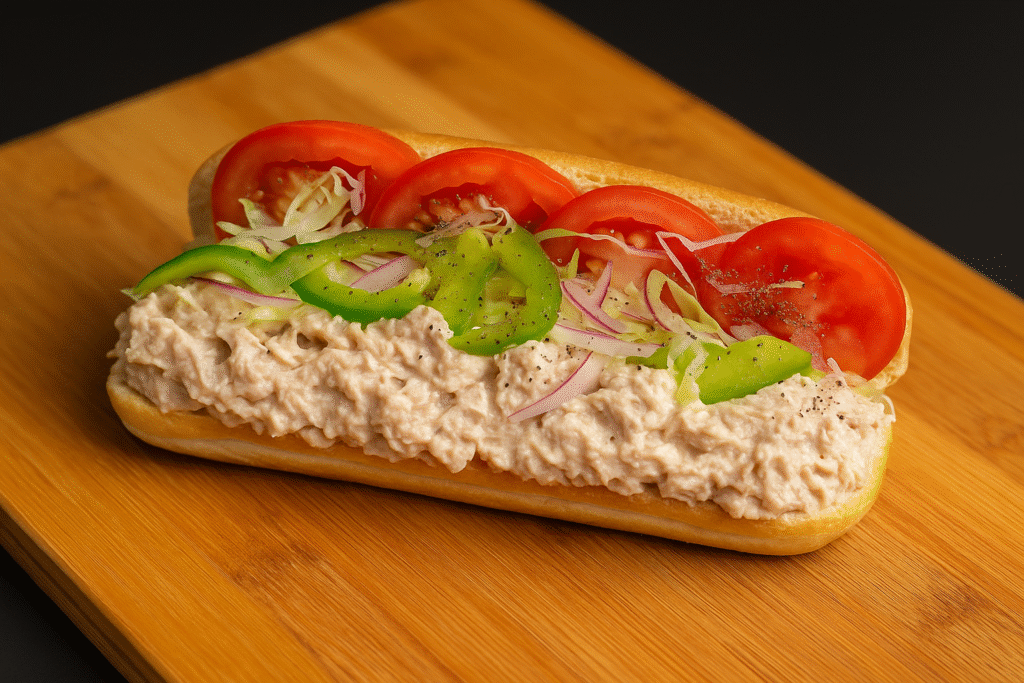 Medium Subs – $12.00 | Large Subs – $14.00 An tuna salad sub sandwich on a wooden cutting board. The sandwich features a generous layer of creamy tuna salad topped with shredded lettuce, sliced tomatoes, onions, and green peppers inside a fresh sub roll.