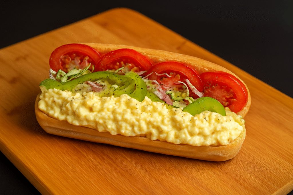 Medium Subs – $12.00 | Large Subs – $14.00 An egg salad sub sandwich on a wooden cutting board. The sandwich features a generous layer of creamy egg salad topped with shredded lettuce, sliced tomatoes, onions, and green peppers inside a fresh sub roll.