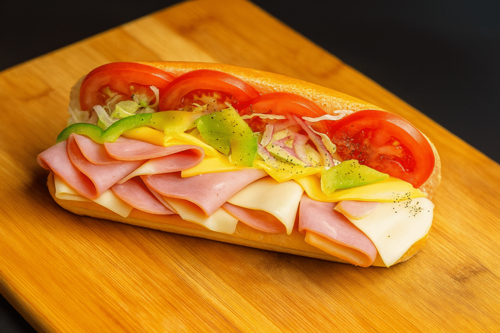 Medium Subs – $12.00 | Large Subs – $14.00 A freshly made ham and cheese sub sandwich. The sandwich is layered with sliced ham, American cheese, tomato slices, green bell peppers, and thin red onion, on a soft sub roll.