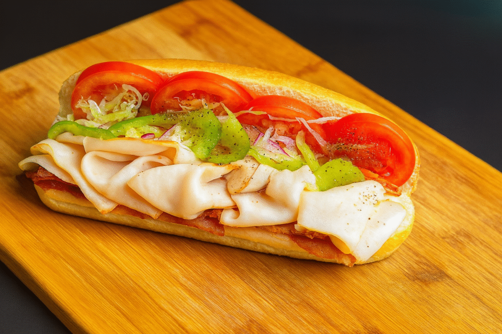 Medium Subs – $12.00 | Large Subs – $14.00 A freshly made sub sandwich featuring layers of turkey topped with shredded lettuce, tomato slices, red onions, and green bell peppers, all on a fresh hoagie roll.