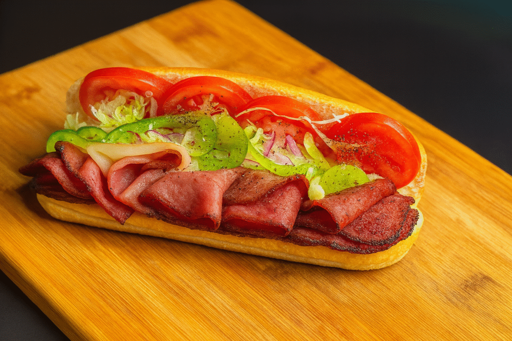 Medium Subs – $12.00 | Large Subs – $14.00 A freshly prepared pastrami sub sandwich on a wooden board. The sandwich features slices of pastrami layered with shredded lettuce, sliced tomatoes, red onions, and green bell peppers.