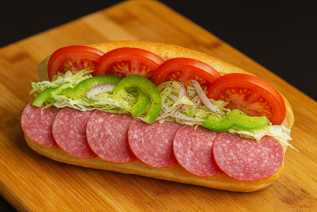 Medium Subs – $12.00 | Large Subs – $14.00 A fresh Salami sub stacked with layers of savory salami, crisp lettuce, juicy tomatoes, green peppers, red onions, and a dash of black pepper, all nestled in a soft hoagie roll.
