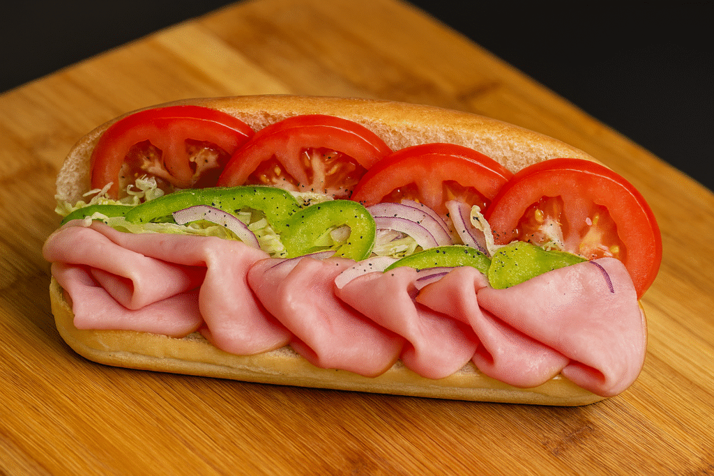 Medium Subs – $12.00 | Large Subs – $14.00 A fresh ham sub stacked with tender slices of deli ham, crisp lettuce, juicy tomatoes, red onions, and green peppers seasoned with black pepper and served golden sub roll.
