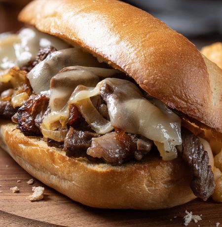 The sandwich is filled with tender sliced steak, melted cheese, grilled onions, and green peppers, all inside a toasted hoagie roll.