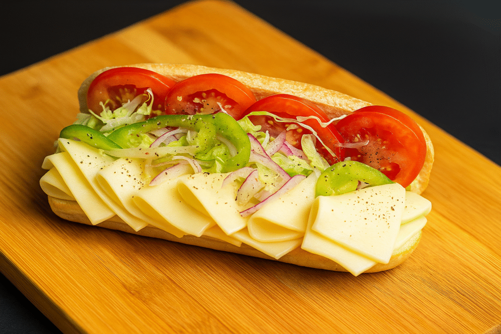 Medium Subs – $12.00 | Large Subs – $14.00 A vegetarian cheese sandwich. The sandwich is filled with sliced cheddar and provolone cheeses, layered with shredded lettuce, tomato slices, green bell peppers, sliced red onions.