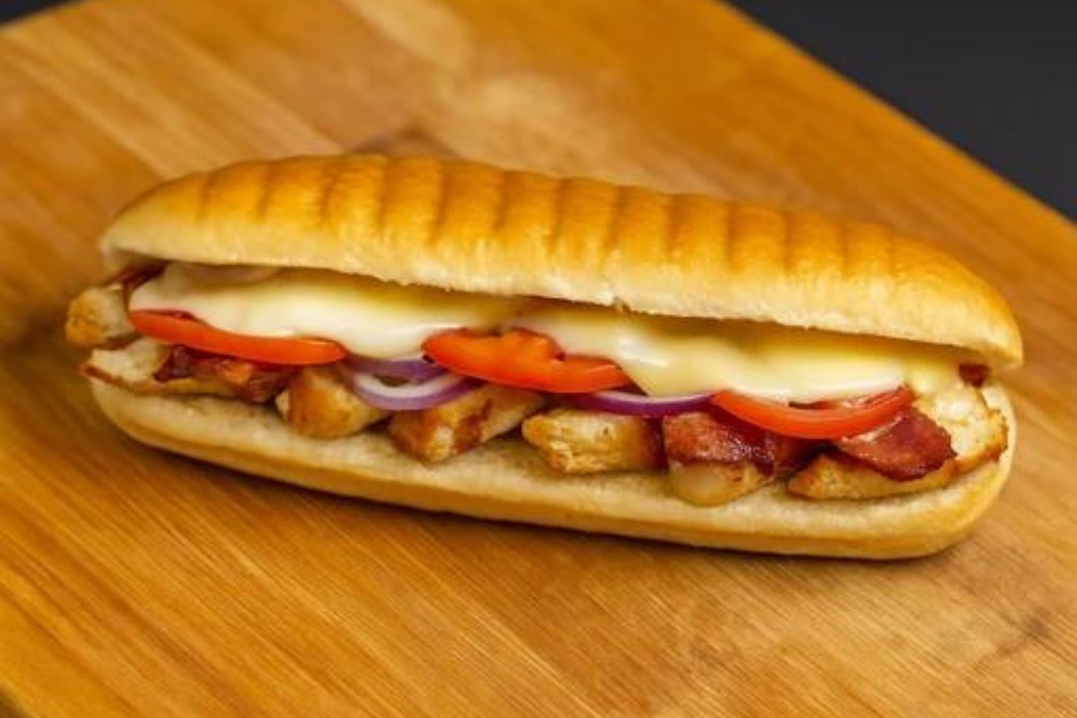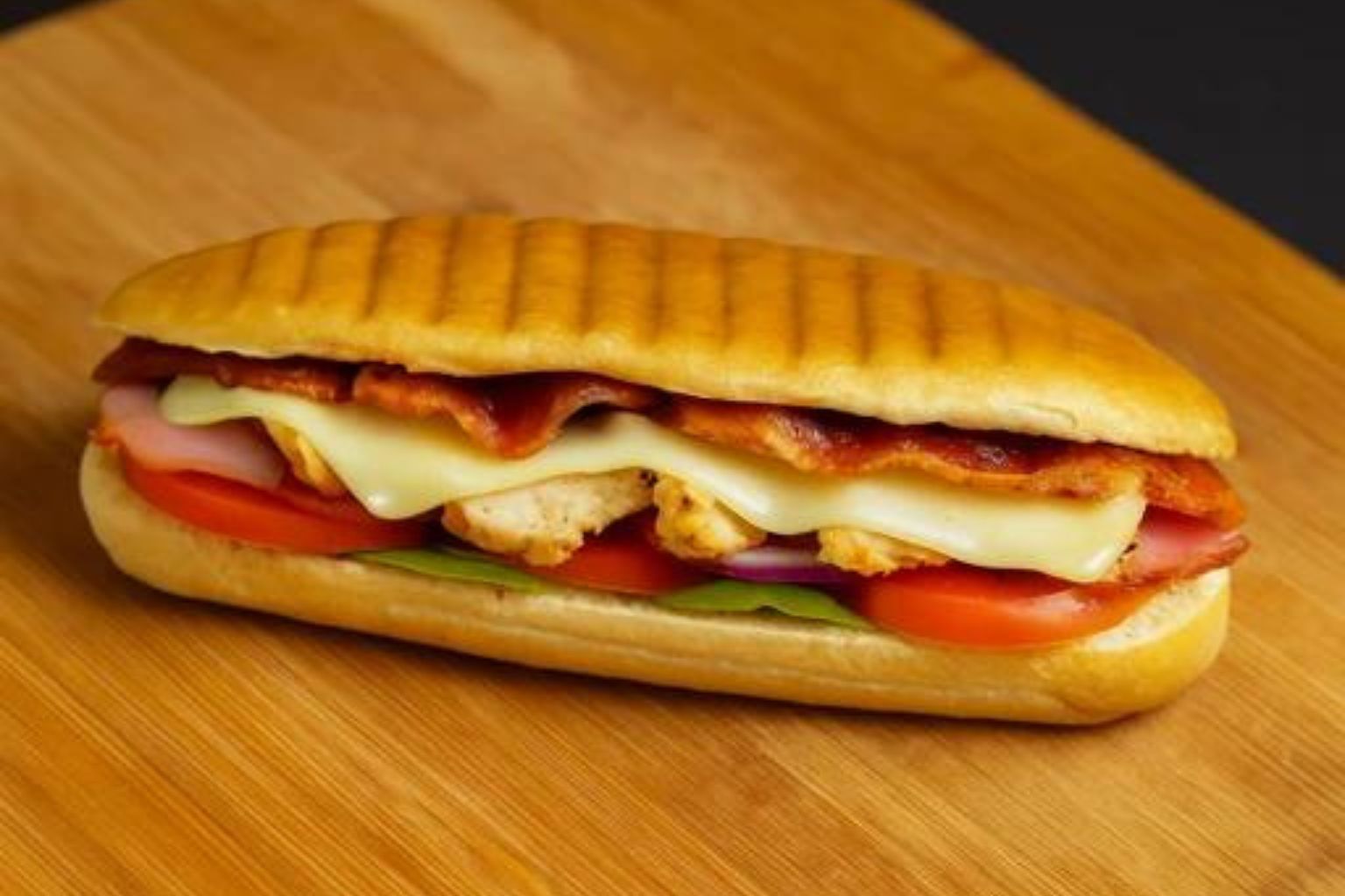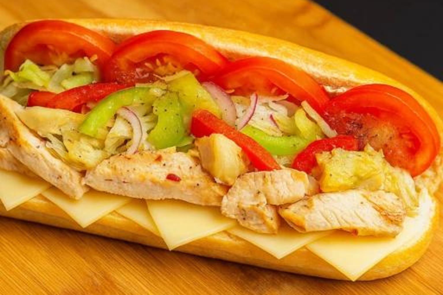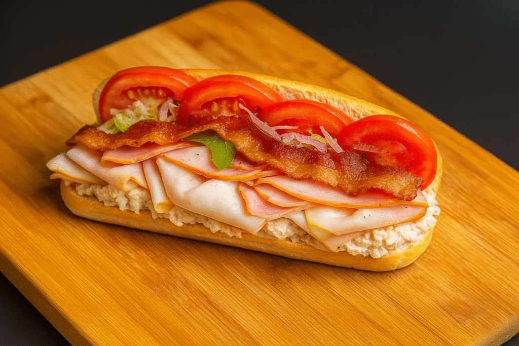 Medium Subs – $12.00 | Large Subs – $14.00 A fresh sub sandwich filled with ham, turkey, crispy bacon and chicken salad. The sandwich is topped with lettuce, sliced tomatoes, onions, green peppers, and black pepper.