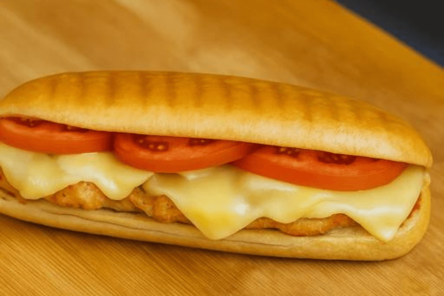 Chicken Cordon Bleu, layered with melted cheese, ham, and sliced tomatoes on a golden grilled baguette.