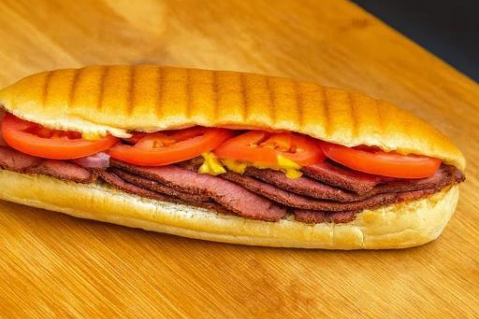 Hot pastrami sandwich on a toasted sub roll, layered with sliced tomatoes, mustard, and red onions.