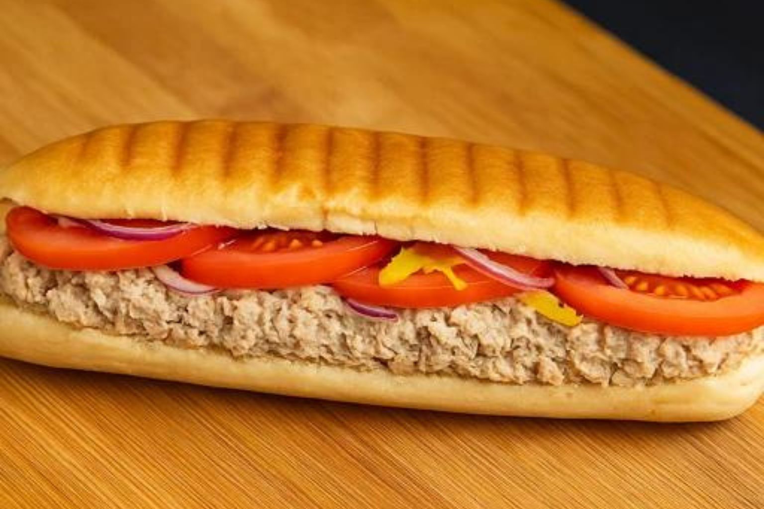 A fresh Mediterranean tuna sandwich on a toasted sub roll, layered with juicy tomato slices, shredded cheese, and crisp red onions.