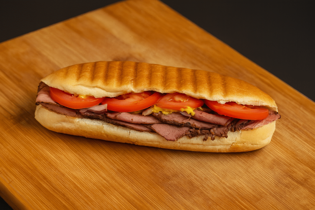 Medium Subs – $12.00 | Large Subs – $14.00 This hot roast beef panini features tender, thinly sliced roast beef stacked on a warm, golden-pressed sub roll. Juicy tomato slices, sharp red onions, and a drizzle of tangy mustard add .