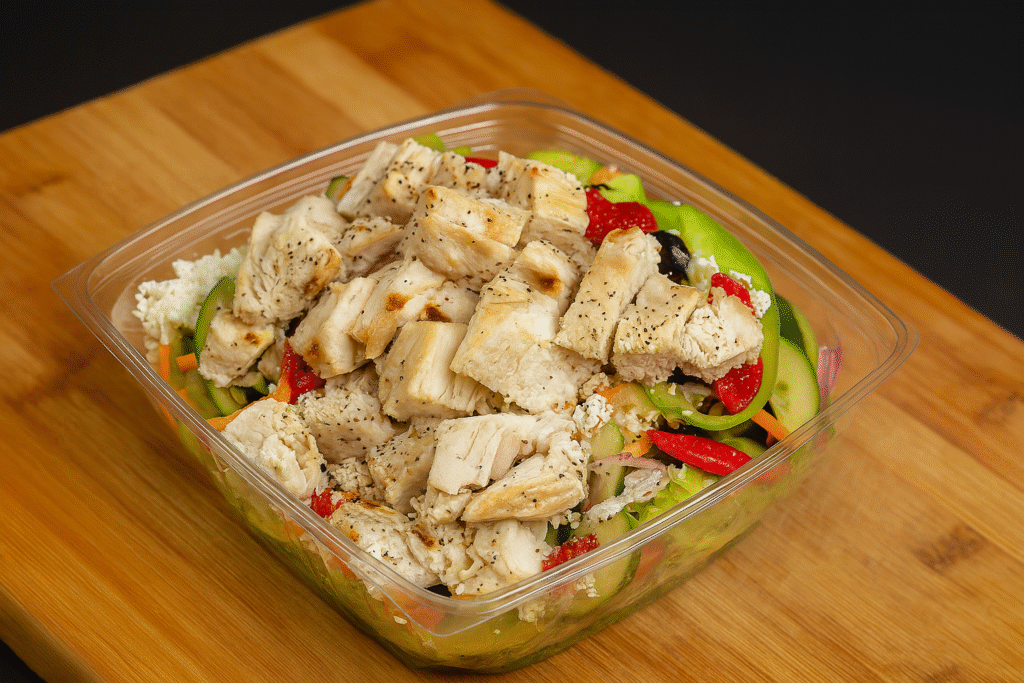 All Salads – $12.00 A vibrant grilled chicken salad loaded with juicy, seasoned chicken breast atop crisp lettuce, cucumbers, bell peppers, olives, and feta fresh, hearty, and packed with flavor.