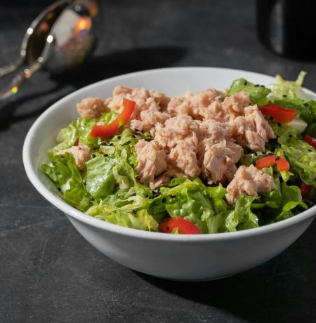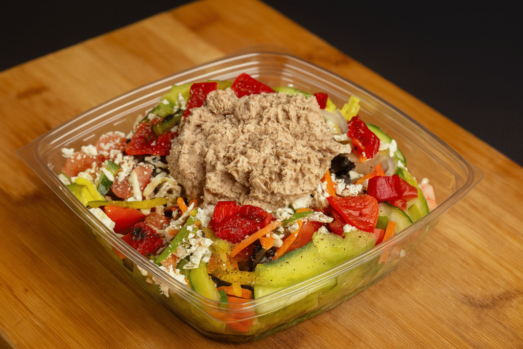All Salads – $12.00 A fresh and colorful tuna salad topped with a generous scoop of seasoned tuna, served over crisp lettuce, tomatoes, cucumbers, peppers, olives, and crumbled feta—light, flavorful, and satisfying.