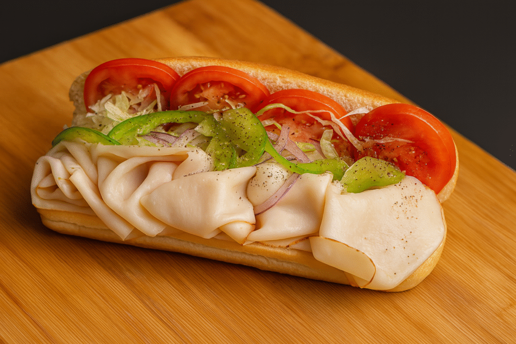 A fresh, flavor-packed turkey sub loaded with tender sliced turkey, crisp lettuce, juicy tomatoes, onions, and peppers topped with black pepper on a soft, golden sub roll. Irresistibly satisfying in every bite.